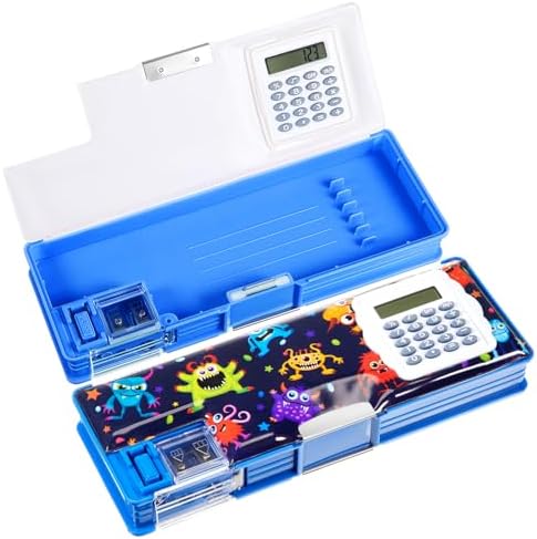 It includes a built-in calculator for quick calculations and likely has multiple compartments for organizing stationery items like pens, pencils, and erasers.